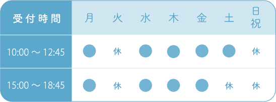 - 初診の方は受付を12:30、18:30までにお願いします。